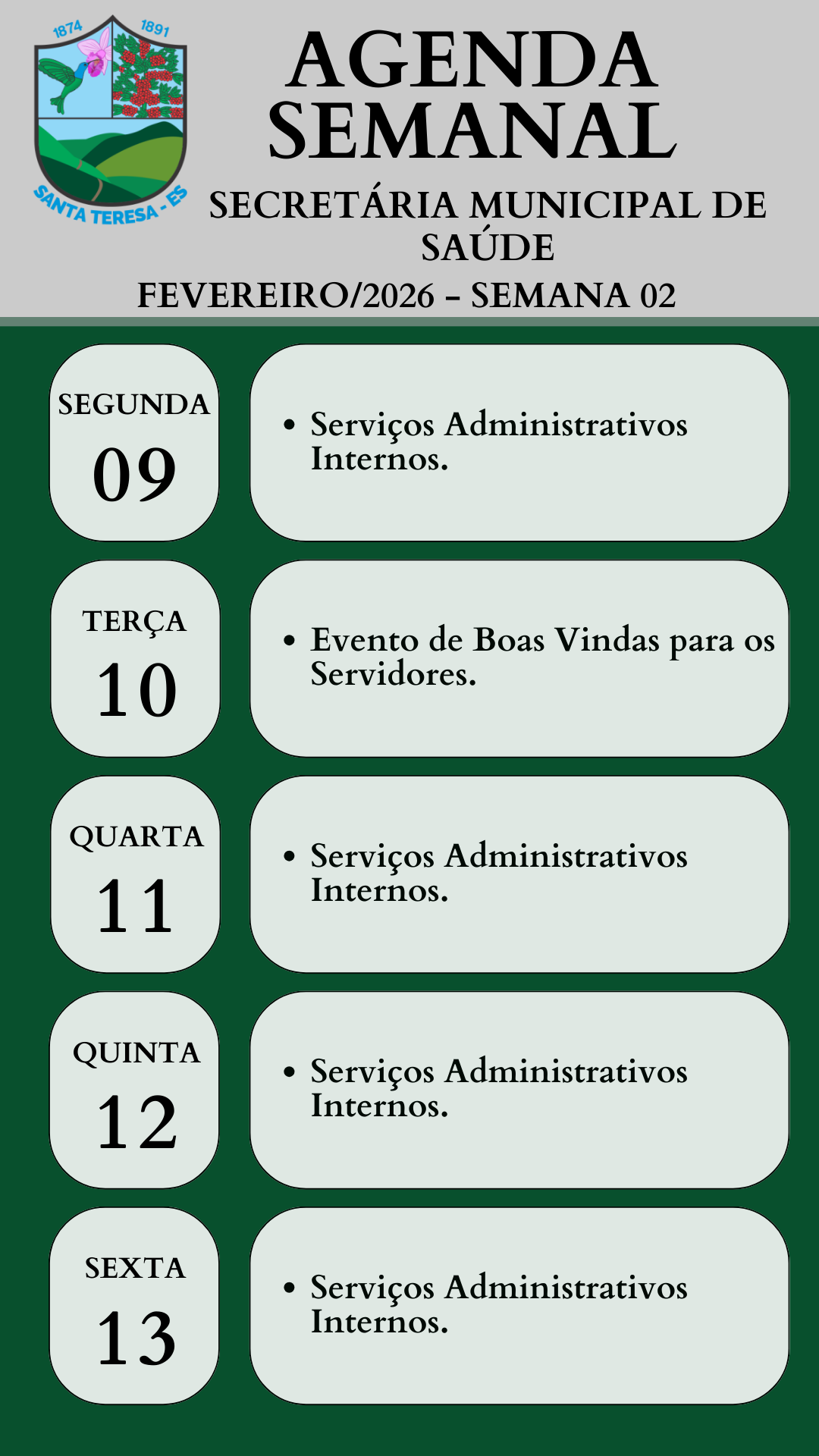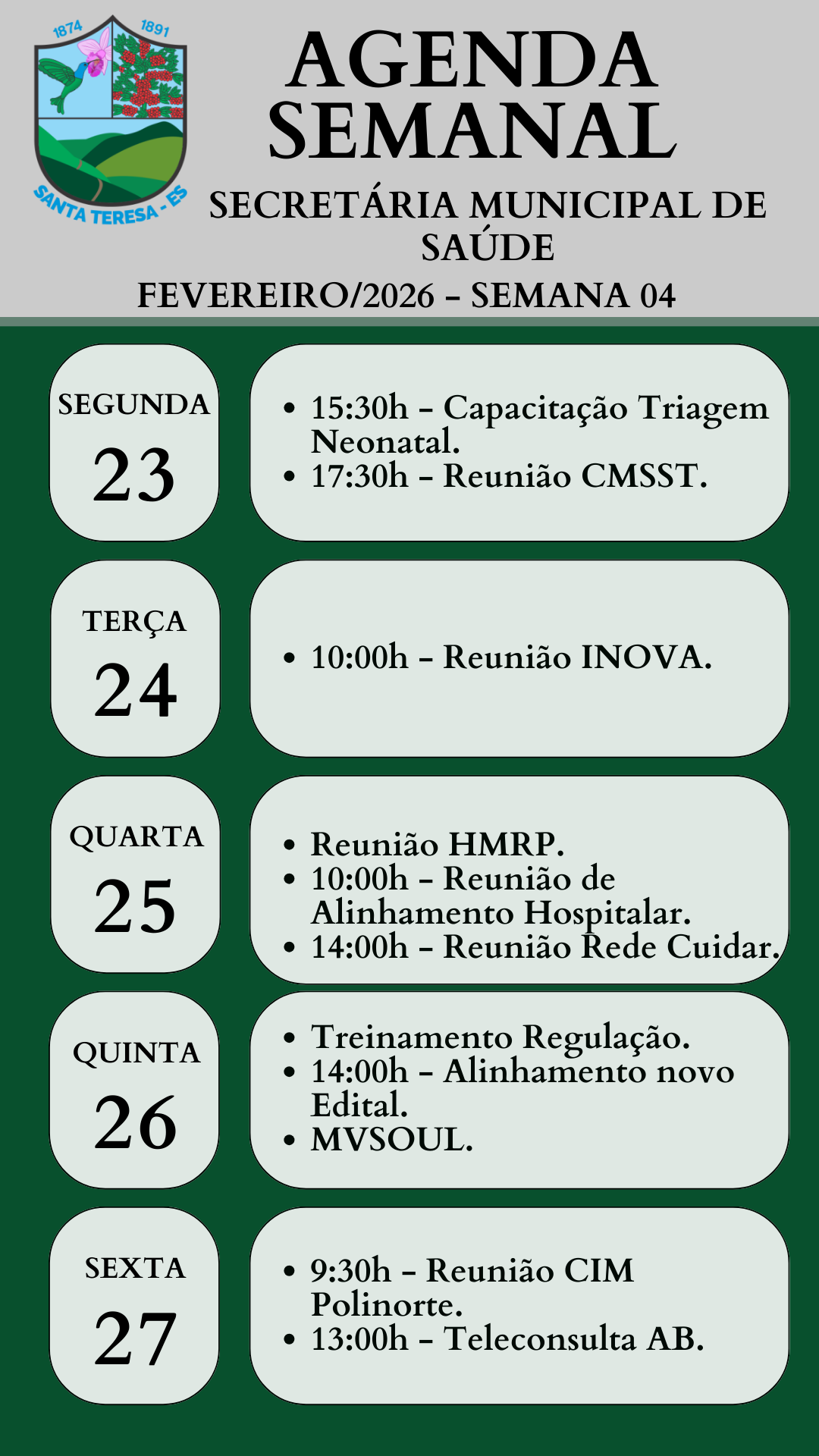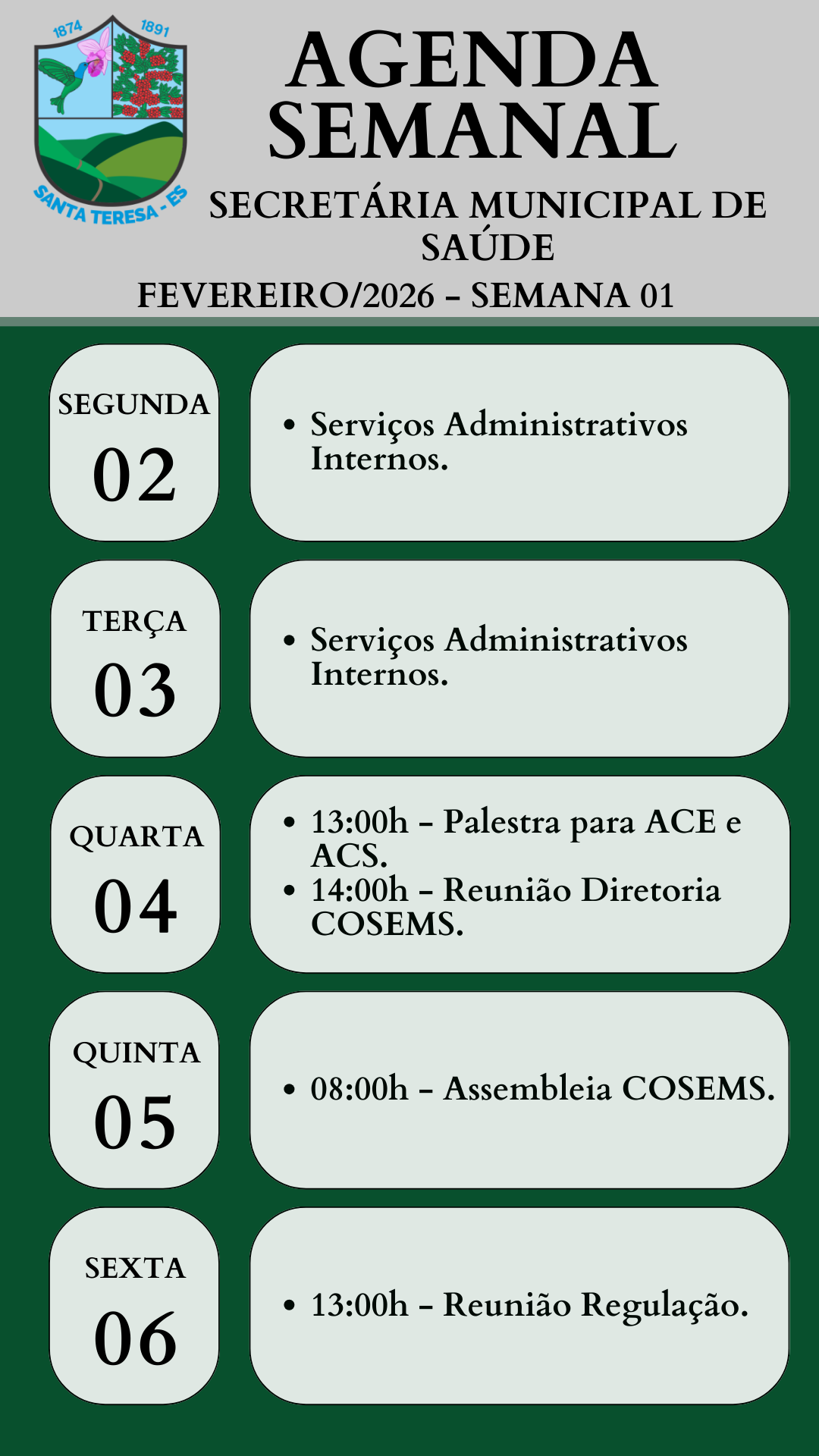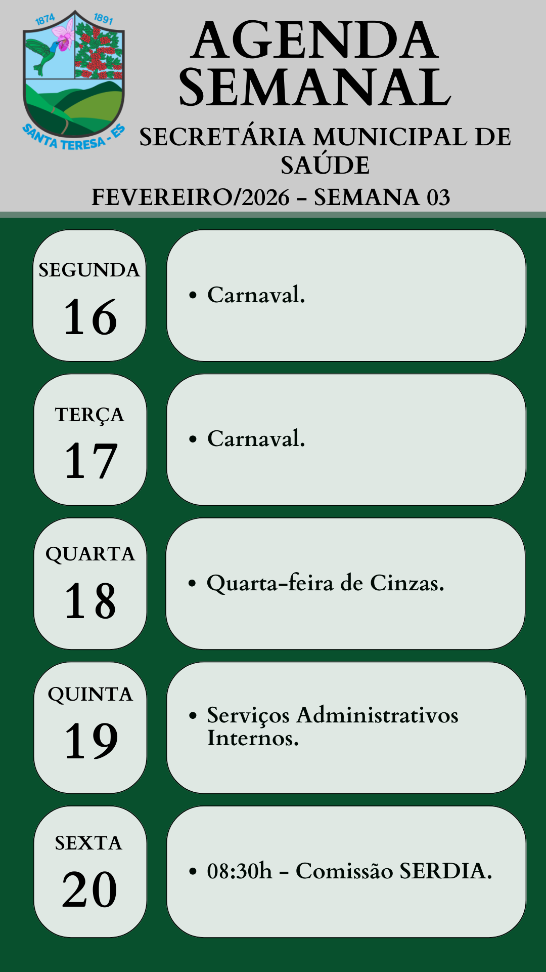 | Mensal | 16/03/2026 | 2026 | Fevereiro | Agenda da Secretária Municipal de Saúde referente ao mês de Fevereiro/2026 - Semana 03 (De 16 à 20/02/2026). | Agenda Semanal - Secretária Municipal de Saúde [Semana 03 - De 16 à 20_02_2026].png | 224.12 KB |