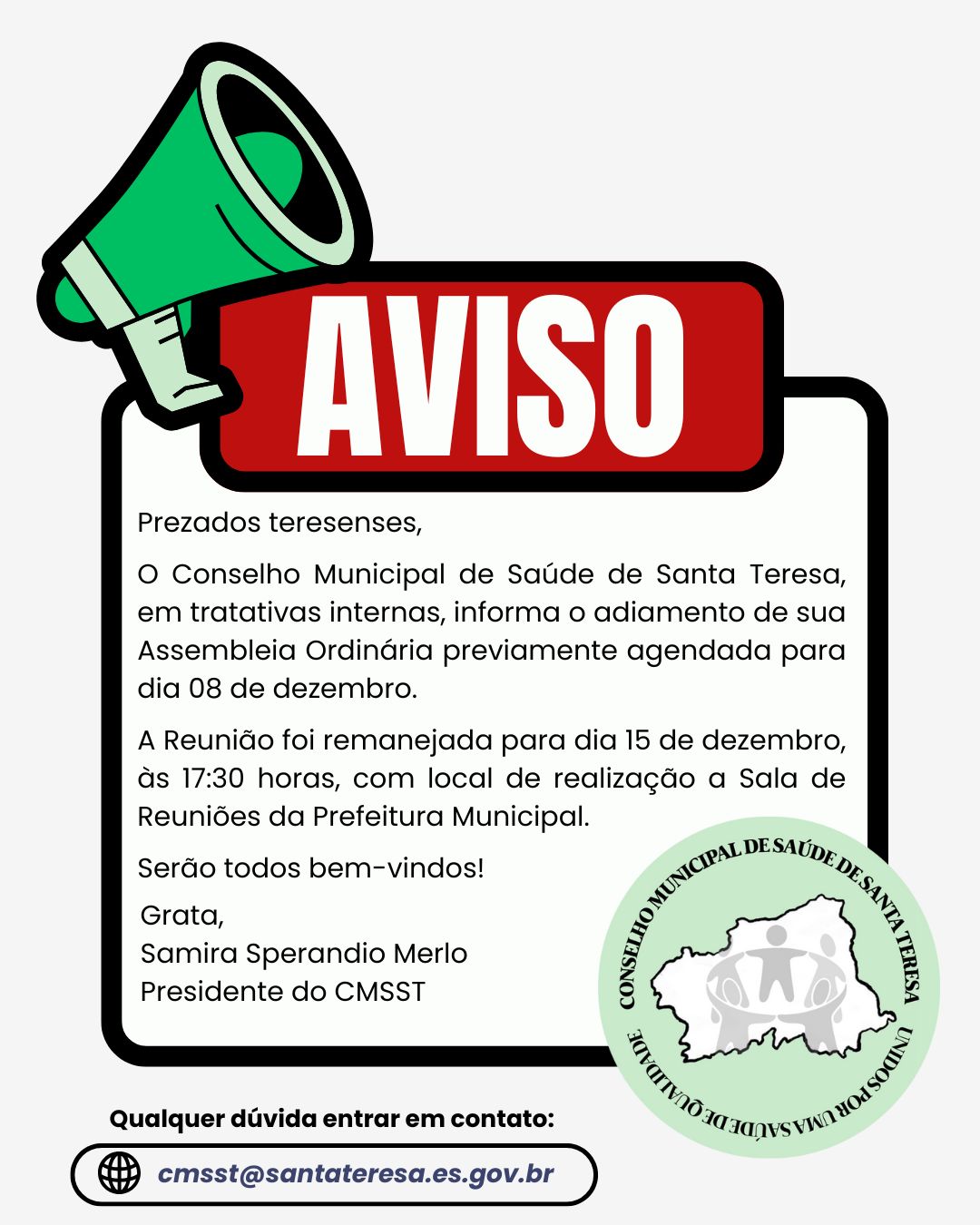 | Não se Aplica | 05/12/2025 | 2025 | Não se Aplica | AVISO - Prezados teresenses: O Conselho Municipal de Saúde de Santa Teresa informa o adiamento de sua Assembleia Ordinária previamente agendada para dia 08 de dezembro. A Reunião foi remanejada para dia 15 de dezembro, às 17:30 horas, com local de realização a Sala de Reuniões da Prefeitura Municipal. | AVISO - Adiamento de Assembleia Ordinária do Conselho Municipal de Saúde (Mês de Dezembro 2025).jpg | 177.62 KB |