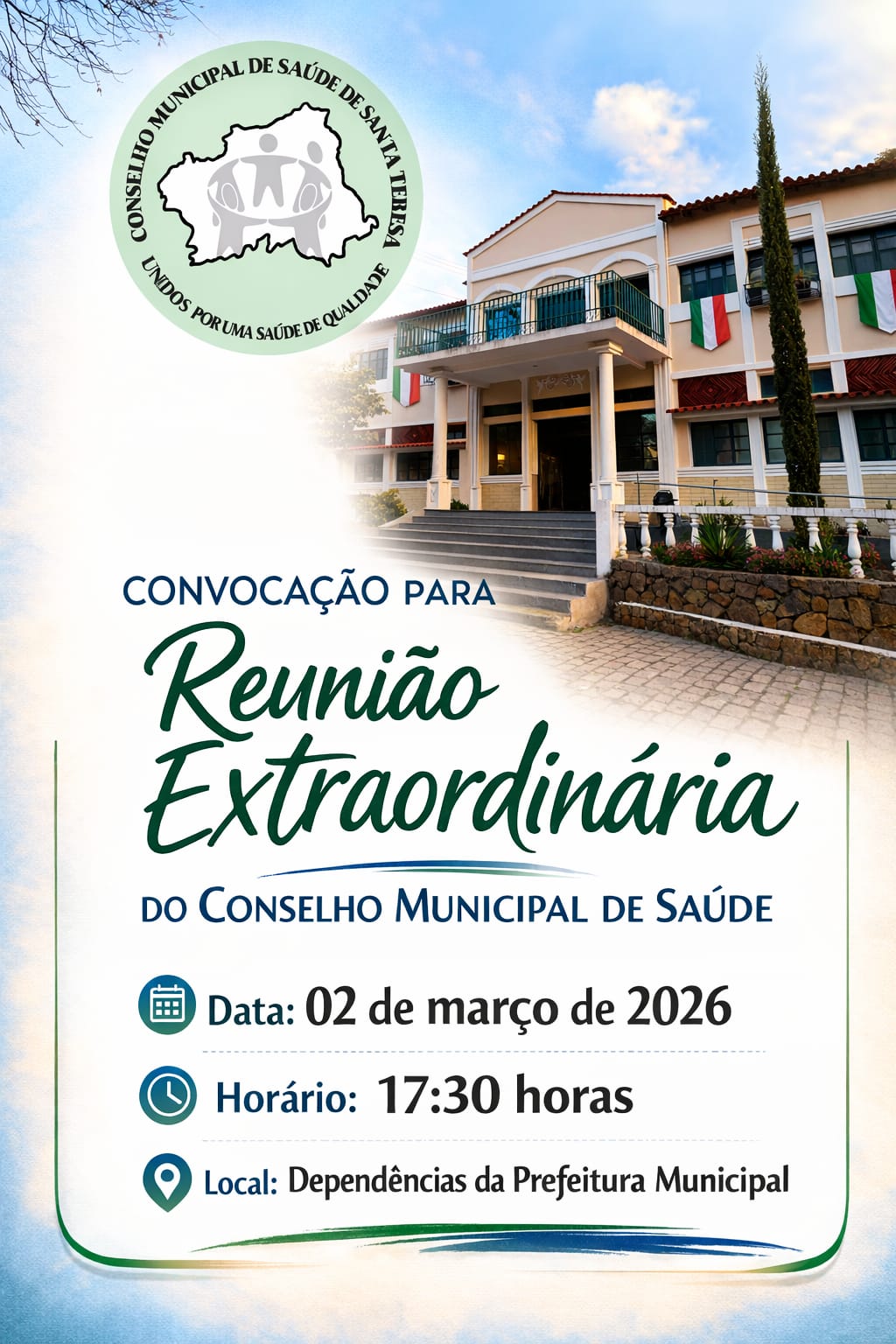 | Não se Aplica | 27/02/2026 | 2026 | Não se Aplica | CONVOCAÇÃO PARA REUNIÃO EXTRAORDINÁRIA DO CONSELHO MUNICIPAL DE SAÚDE: O Conselho Municipal de Saúde de Santa Teresa (CMSST) convoca para a sua Reunião Extraordinária a ser realizada na próxima segunda-feira, dia 02 de março de 2026, às 17:30 horas, nas dependências da Prefeitura Municipal de Santa Teresa/ES. | Convocação - Reunião Extraordinária do Conselho Municipal de Saúde de Santa Teresa (02_03_2026).jpeg | 205.65 KB |